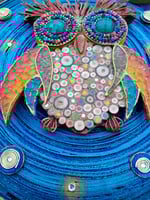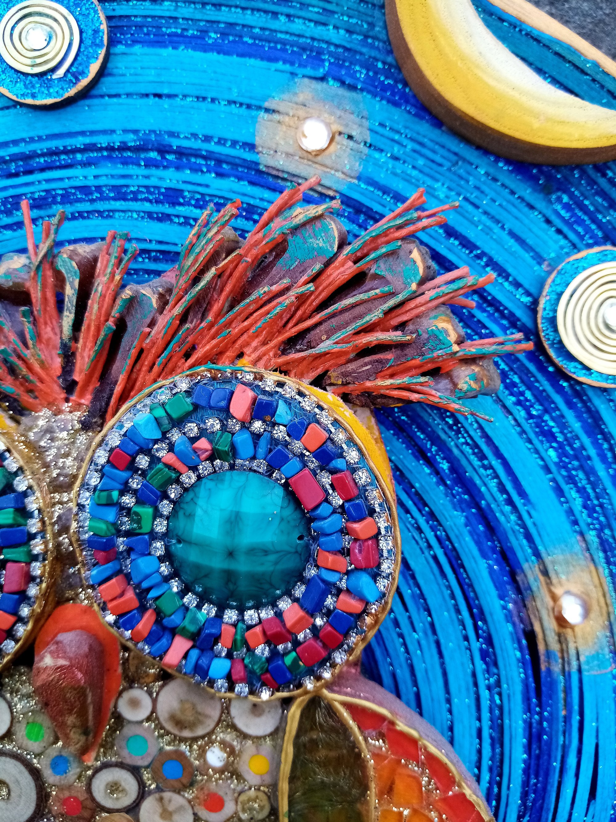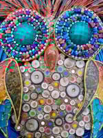 Gufo su base rotonda di legno. Realizzato nel mio inconfondibile mosaico di sezioni di legno, matite e pigne. Insieme ai materiali naturali trovate anche dettagli in mosaico di specchietti, vetro colorato, matite, accessori colorati. Stelle in metallo e strass.