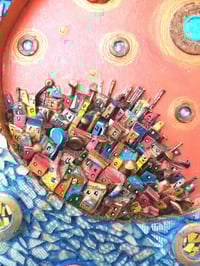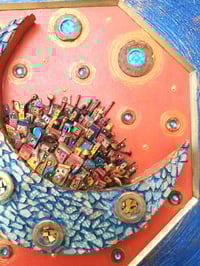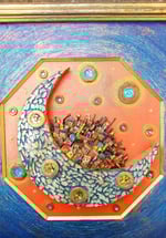 Quadro realizzato dentro una cornice dorata antica. Rappresenta un paesaggio dalle atmosfere fra il fiabesco e mitologico. Una sorta di Arca di Noè sulla Luna. Le piccole case sono tutte in legno, dipinte una ad una ed assemblate successivamente. La Luna è in legno sovrastata da un mosaico di vetro di varie forme e colori, incluso vetro con foglia d'oro. Il quadro è realizzato nella mia tecnica mista di mosaico ed assemblaggio di legno vetro, specchietti, metallo, piccoli accessori. Le stelle sono in metallo e mosaico di vetro. Gancio applicato sul retro per appendere il quadro al muro.
