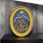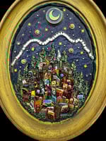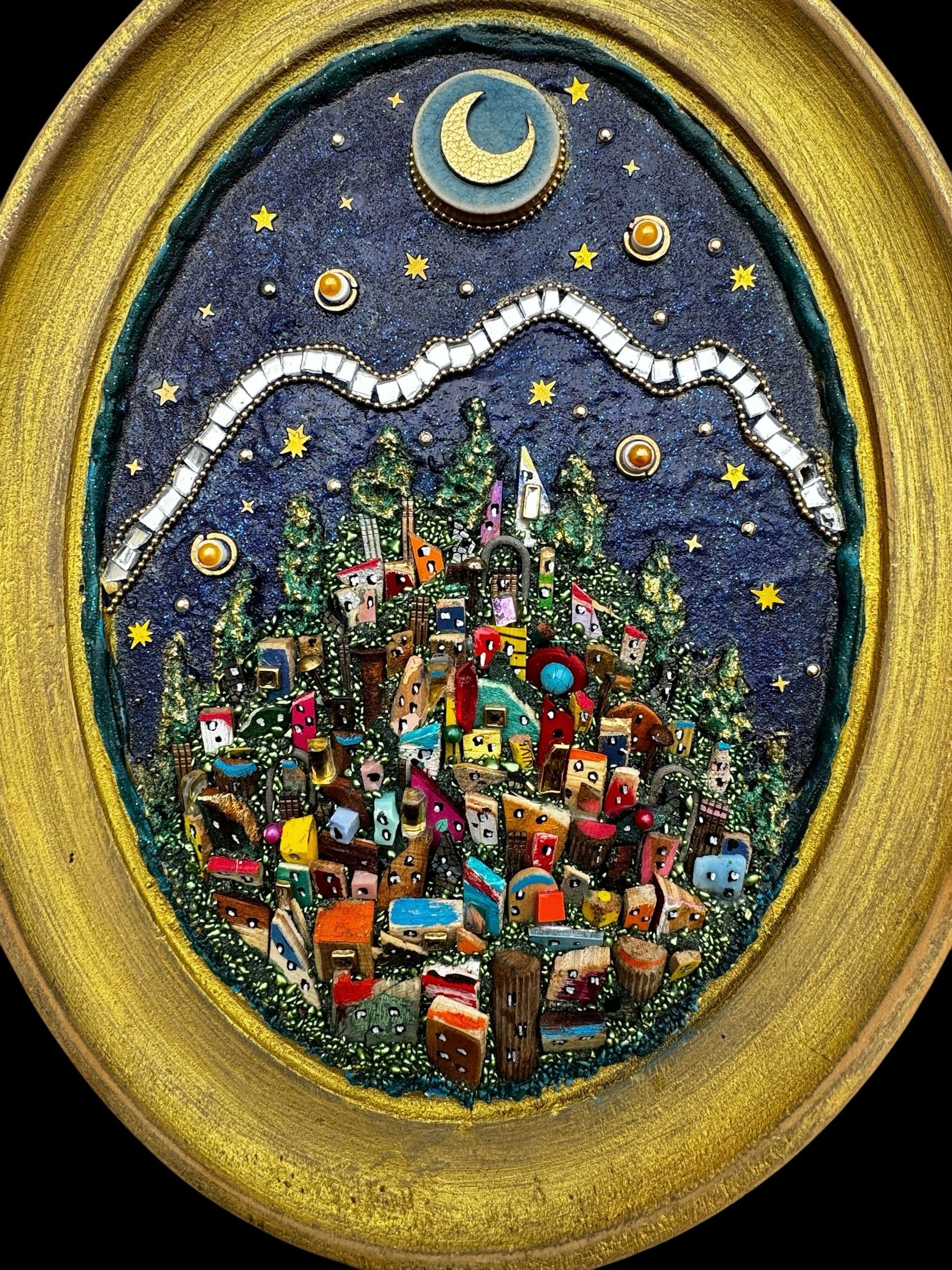 ENG: artwork made inside an antique golden painted oval frame. It represents a landscape with a fairy-tale atmosphere. The small houses are all made of wood, painted one by one and then assembled all together . The piece is made in my mixed technique of mosaic and assembly of wood, glass, mirrors, metal, small accessories. Hook applied on the back to hang the artwork on the wall.