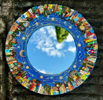Materials: recycled wood and metal. Mirrors mosaic and accessories for details. Diameter 28 cm. Already equipped with a hook to hang it to the wall