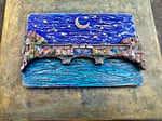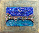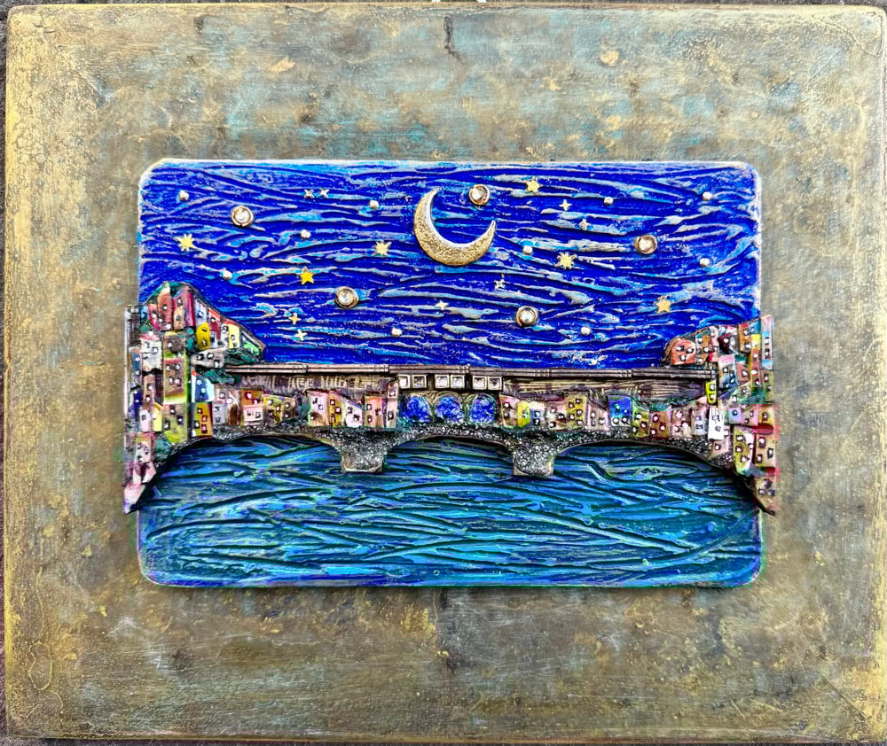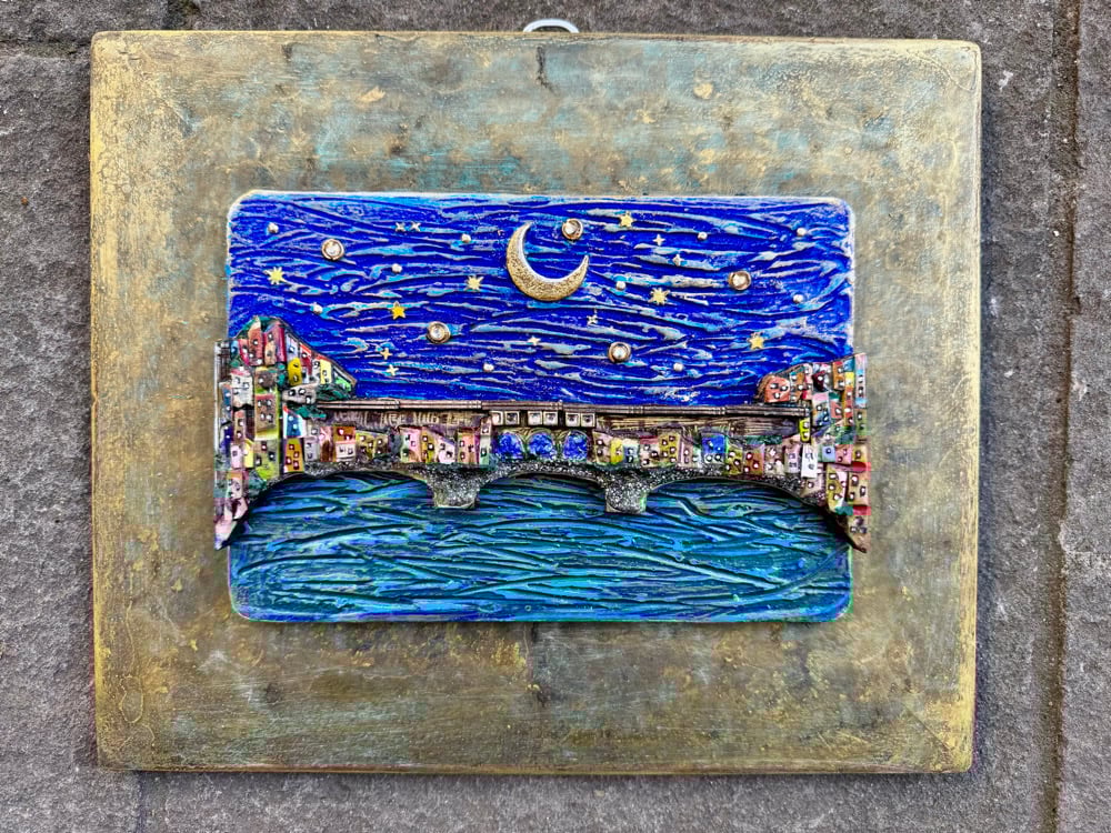 ponte Vecchio . La base di legno è trattata con stucchi e colori acrilici per creare una notte luminosa ed un fiume Arno in scintillante movimento . Misura 25 x 30 cm , gancio già applicato sul retro