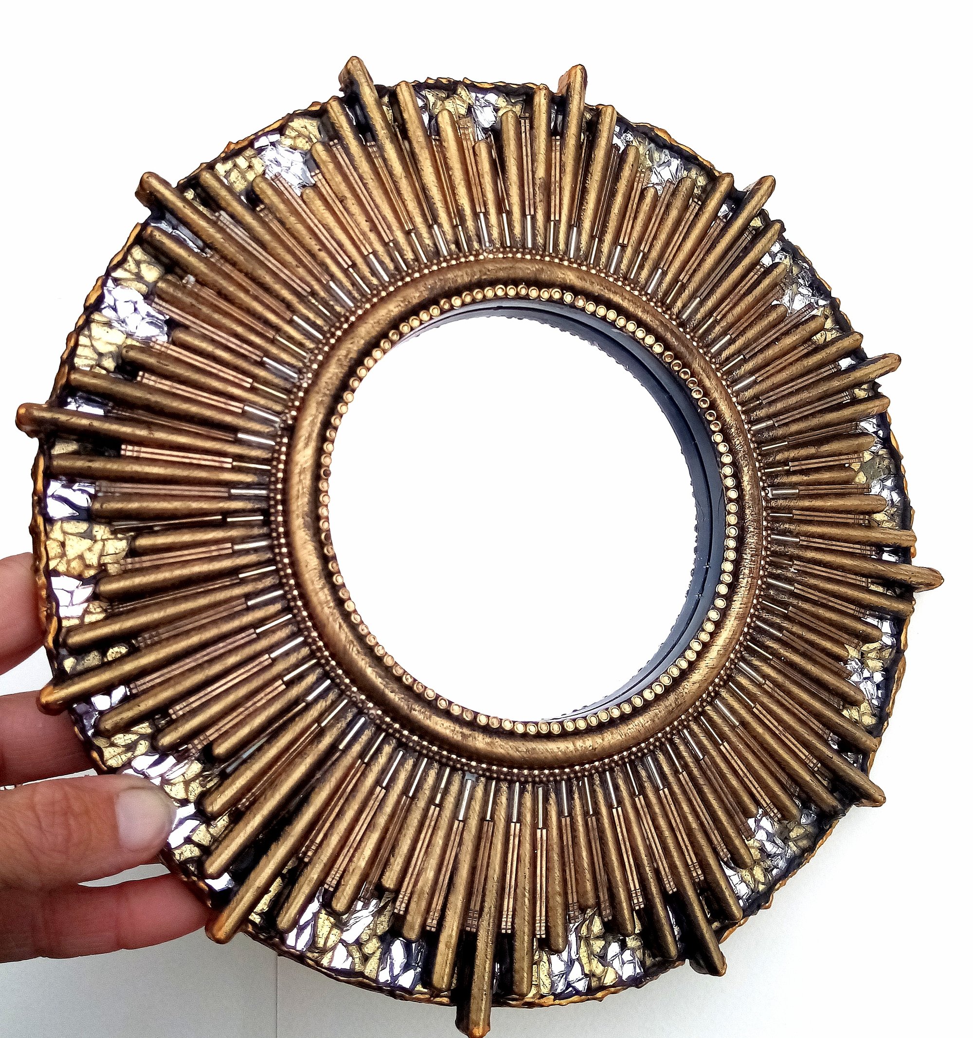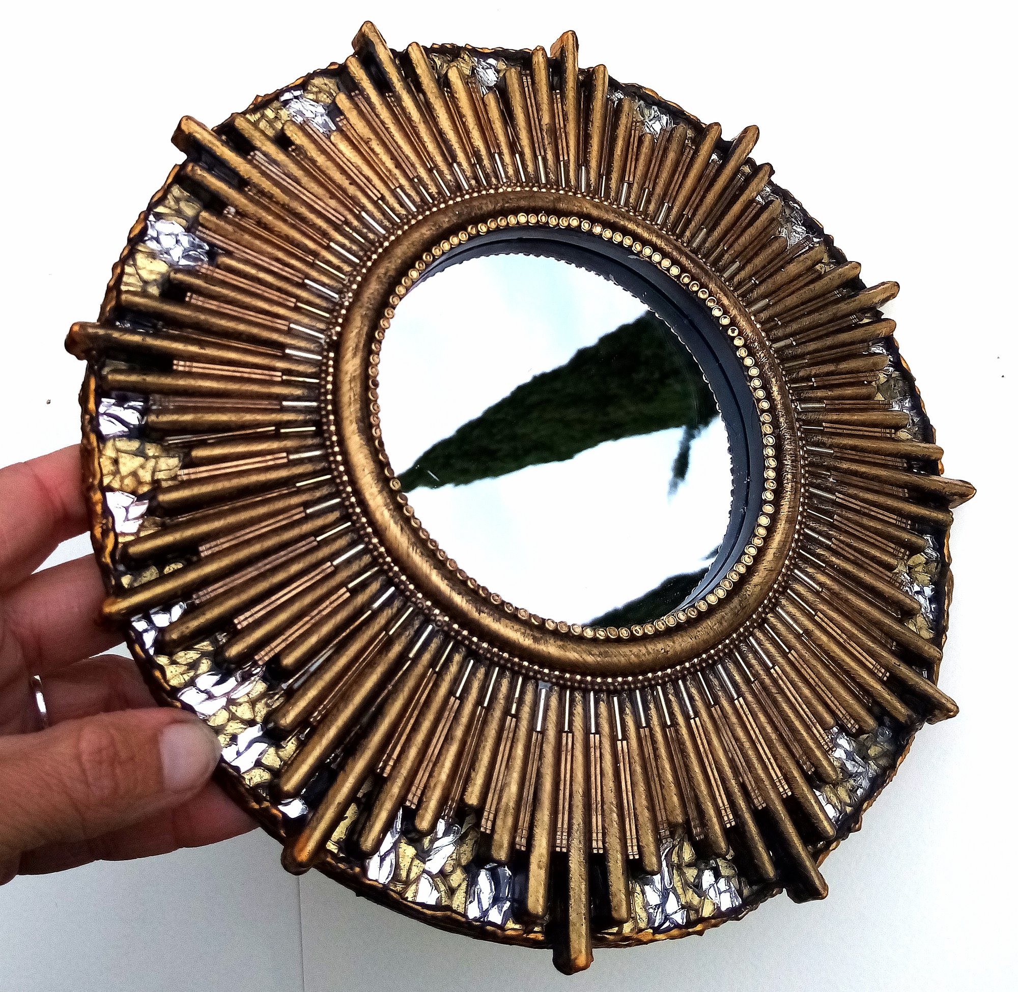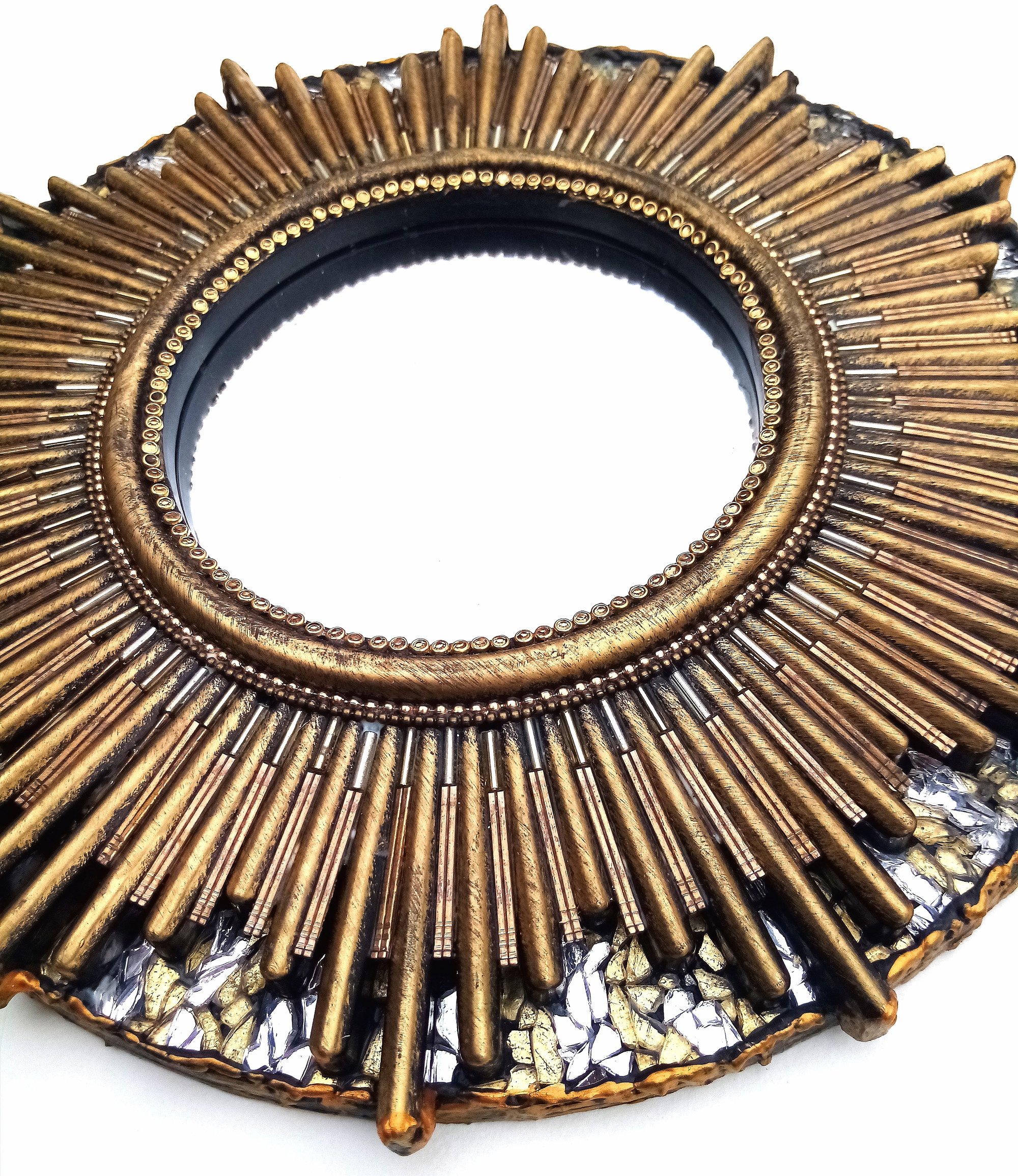 Una piccola specchiera con una luminosissima decorazione a mosaico con vetro foglia oro, specchietti e metallo. Questa ha diametro 25 cm, gancio sul retro.