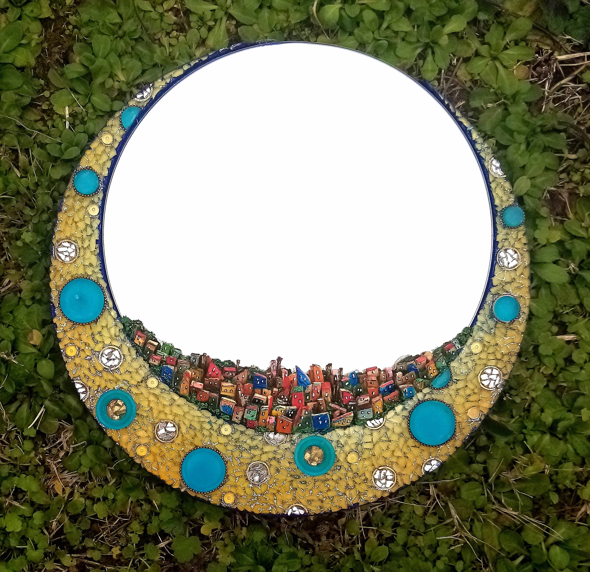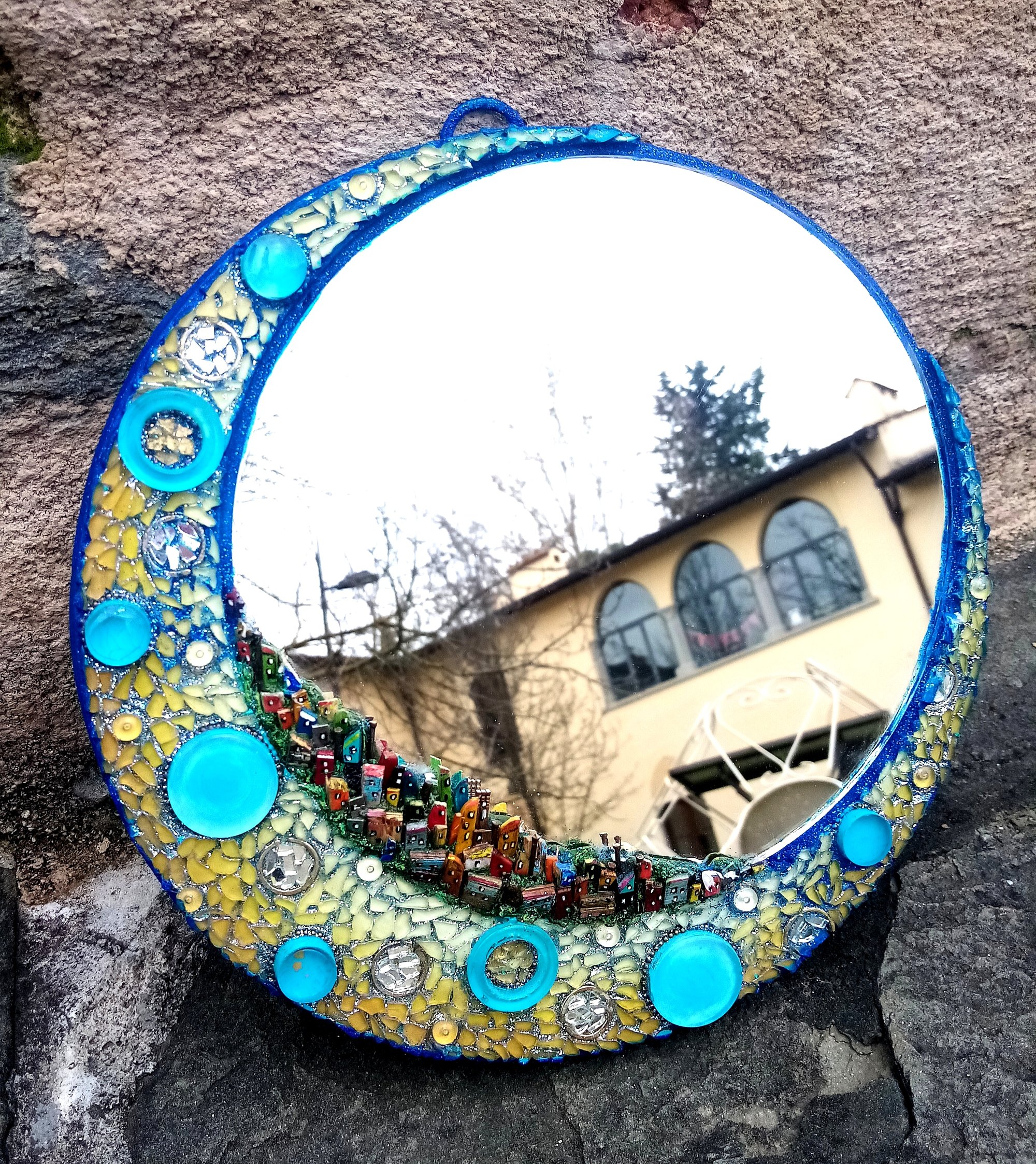 Una piccola preziosa specchiera con un dettagliatissimo lavoro di mosaico di vetro e specchietti sulla luna .le casine sono invece realizzate assemblando piccoli pezzetti di legno di recupero,ognuno dipinto a mano . Sono disponibili 2 misure.