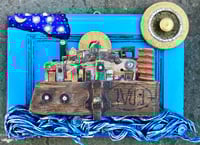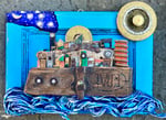 Un viaggio lunghissimo di tanti giorni e tante notti accompagnato da vecchi canti marinari. La notte è rappresentata come Un fumo blu stellato che esce dal bastimento mentre sulla destra c'è un grande sole caldissimo. La contemporaneità del giorno e della notte nello stesso pezzo continua a ripetersi nelle mie opere, a rappresentare l'unità e la complementarità di tutte le cose nel nostro Universo. Misura 48 cm di larghezza comprese le onde per 34 cm altezza e circa 11 cm di spessore, Gancio già applicato